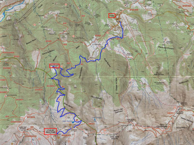 Dall'incrocio nei pressi della chiesa, si procede a sinistra lungo la via Arguel. Dopo un tornante, nei pressi del quale termina l'asfalto, si arriva al bivio con la via Gran Serin dove si continua a destra, con un lungo mezza costa. Dopo circa 1,5km prestare attenzione a lasciare sulla sinistra la strada per la Bergeria Soubeirand. Raggiungeree baite e la chiesetta dell'Alpe d'Arguel. Il bosco di larici sin qui attraversato cede ora gradualmente spazio ad ampie praterie. Superata una sbarra, si affrontano i tornanti che si sviluppano lungo il confine del Parco Naturale Gran Bosco raggiungendo la conca che ospita il lago Grande, dove si incontra la vecchia strada che collegava il Colle delle Finestre con l'Assietta, sul lato val Chisone. In breve si raggiungono i ruderi della grossa caserma difensiva del Gran Serin, costruita tra il 1884 ed il 1888 ed in grado di ospitare fino a 600 uomini. Un largo e profondo fossato la proteggeva su tre lati mentre all'interno si riconoscono due grossi fabbricati, separati da un ampio cortile: uno era destinato ad ospitare la truppa mentre l'altro, formato da un corpo centrale su due piani come il precedente ma con due appendici laterali ad uno solo, era invece riservato agli Ufficiali ed ai locali di servizio tra cui una grossa cisterna per l'acqua da 100.000 litri. Salendo per tracce di fianco alla cresta e per valloncelli, oppure lungo la mulattiera si arriva alla Batteria del Gran Serin |