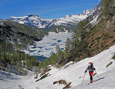 1° Giorno Scatta Minoia 2599m DallAlpe Devero, identificare il Rifugio Castiglioni 1640m e di qui dirigersi in direzione Est, poi Nord-Est seguendo il corso del torrente Devero. Tratti in leggera salita si alternano a zone completamente pianeggianti sino ad un lungo pianoro, in cui si trovano tre gruppi di baite 1765m, oltre il quale la valle si biforca. Seguire il ramo destro ed, oltrepassata una piccola diga scendere sul lago di Devero per attraversarlo longitudinalmente oppure se le condizioni non lo permettono seguire approssimativamente un sentiero a mezza costa fino al termine del lago. Di qui proseguire in direzione Nord lungo il vallone raggiungendo un altro lago situato nel Pianboglio 1992m. Di qui una valletta ripida e stretta con direzione Nord-Est (la prima verso destra salendo, Rio d'Arbola) permette di raggiungere l'Alpe Forno inferiore 2213m. Proseguendo sempre verso Est, pervenire su terreno molto ampio ad un falso colletto che non è altro che l'accesso all'anfiteatro al fondo del quale si scorge la Scatta Minoia 2599m immediatamente a destra di un evidente torrione roccioso. Scendendo oltre il colle in direzione Nord-Est tenersi prima a sinistra, quindi aggirate alcune zone rocciose, spostarsi sul versante destro del vallone e scendere sul lago Vannino che si costeggia sulla riva destra con un lungo e scomodo mezzacosta su pendii molto ripidi e valangosi sino a raggiungere la diga. Attraversarla giungendo così all'Alpe Vannino dove è posto il Rifugio Margaroli 2194m. 2° Giorno Punta d'Arbola 3235m Dal Rifugio Margaroli 2194m salire con un lungo diagonale verso Nord-Ovest, attraversare i ripidi pendii che scendono a nord del lago Vannino sino a raggiungere la conca del lago Sruer 2351m. Continuando in direzione Ovest, Nord-Ovest prima sul fondo del vallone, poi sul suo lato sinistro (destra orografica), pervenire al Passo del Vannino 2754m dal quale si ha completa vista sia sulla Punta d'Arbola (evidente a sinistra per il caratteristico scivolo di neve) che sul Ghiacciaio del sabbione lungo il quale si svolge l'itinerario di discesa. Per raggiungere la Punta dirigersi in direzione Sud-Ovest su pendii dolcemente inclinati per poi portarsi, con un'ampia svolta a destra, ai piedi dello scivolo nevoso. È possibile risalirlo in sci direttamente sino alla Cima, oppure se le condizioni della neve lo sconsigliano, raggiungere la cresta nevosa che scende verso Est nel suo punto più basso per percorrerla a piedi senza difficoltà. Ridiscesi per l'itinerario di salita al Passo Vannino, proseguire in direzione Nord attraversando diagonalmente il Ghiacciaio del S, raggiungendo il lago del Sabbione. Con una lunga traversata ascendente, su ripidi pen dii raggiungere il Rifugio 3A 2960m. 3° Giorno Blinnenhorn 3374m Dal Rifugio 3A portarsi sul ghiacciaio dei Camosci, dove vi sono i vecchi impianti di sci, attraversare in modo ascendente all'attacco della Sella dei Camosci e risalire il ripido pendio (45° per 50-60m). Dal colletto stupenda vista sul Blinnenhorn. Perdere 50m di dislivello per attraversare il pianeggiante Griesgletscher e dirigersi verso la detritica cresta Sud, Sud-Ovest che si percorre facilmente a piedi sino alla Vetta. Ridiscesi sul Griesgletscher, scendere in direzione Nord-Est mantenendosi sul lato destro; giunti quasi al termine del ghiacciaio, tenersi il più alti possibile sulla destra sino a giungere dopo un lungo traverso al Griespass 2462m. Scendere su ripidi pendii arrivando alla conca di Bettelmatt e, seguendo il vallone al lago di Morasco.