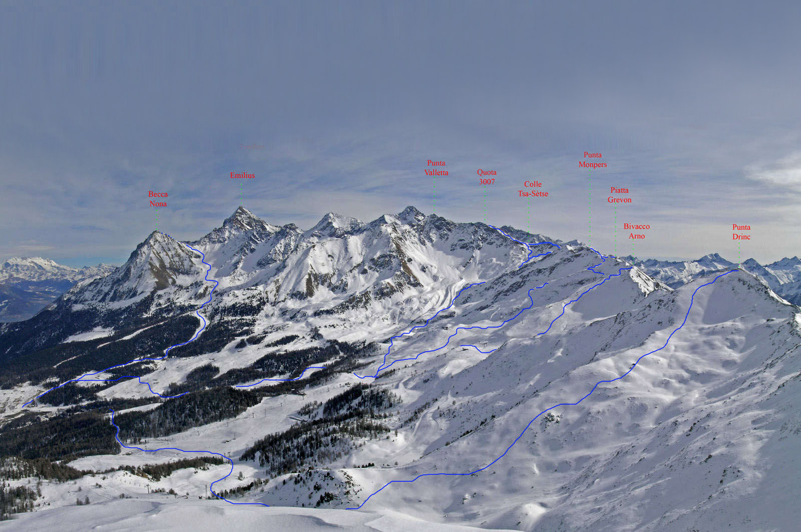 Dal parcheggio di Pila risalire le piste del Plan de l'Evyie (Goillachuye)