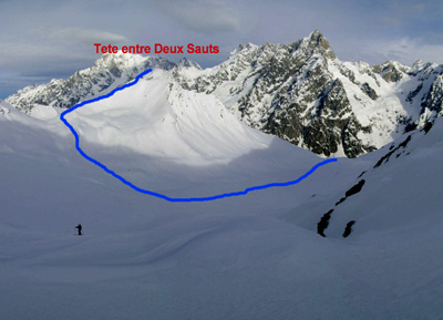 La Tête entre Deux Sauts è una bellissima discesa che offre una vista spettacolare sul Monte Banco e sulle Grandes Jorasses.
