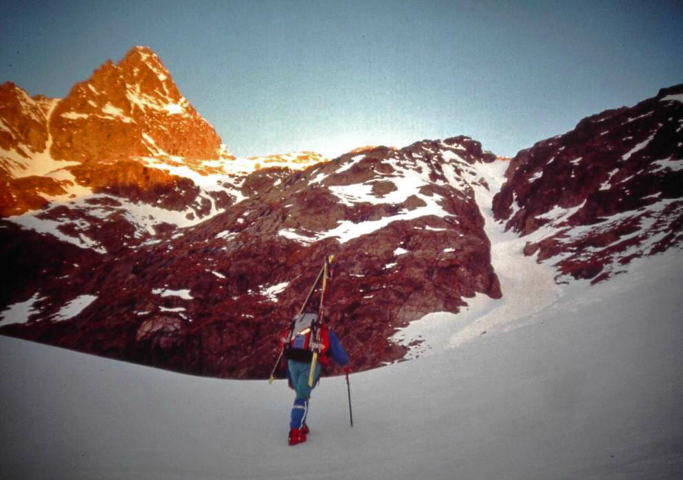 a destra arrivare all'imbocco del couloir della Punta Acquasciati, risalirlo,