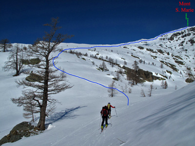 All'inizio dell'ampio parcheggio di Casterino si segue sulla sinistra una carrareccia che, sulla destra di una bella costruzione, s'inoltra nel bosco di conifere. Dopo alcuni tornanti si raggiunge una piccola radura 1731m dalla quale, con lungo percorso diagonale sulla sinistra del Vallon de Fontanalba si prende lentamente quota tra alti larici. Verso i 1800m si taglia un vallone-canale che scende dalla Roche Rousse (bella gita di ripiego), poi si raggiunge un Gias presso un ponticello 1941m. Si piega a sinistra (Sud) lungo il tracciato della carrareccia e si passa presso il Refuge de Fontanalba 2018m (1h30', privato), dal quale vi sono due possibilità. 1) Con neve sicura: si prosegue in lenta salita verso Sud-Ovest tra pini mughi rintracciando poco oltre il percorso estivo della stradina, che piegando a destra si avvicina al corso d'acqua, taglia il ripido e valangoso pendio settentrionale della Cime de Chanvrairèe e della Baisse de la Vallaurette, poi supera il rio su un ponticello 2130m poco a valle della conca del Lac Vert de Fontanalba. Lasciato il lago sulla sinistra, si raggiunge il bel pianoro 2200m alla base delle Chappes di Fontanalba. 2) Con neve pericolosa: poco oltre il Refuge de Fontanalba 2018m, a circa 2050m, con un traverso pianeggiante verso destra (Ovest) tra piccoli larici si giunge sul fondo del vallone e si attraversa al meglio il Rio. Passati sulla sponda sinistra orografica si risale il pendio tra begli esemplari di larici fino al ripiano della Vacherie Supèrieure, dove si taglia il tracciato della stradina di cui sopra presso quota 2188m, giungendo poco dopo al pianoro alla base delle Chappes di Fontanalba. Si prosegue verso Nord-Ovest con pendenza regolare nell'avvallamento sulla