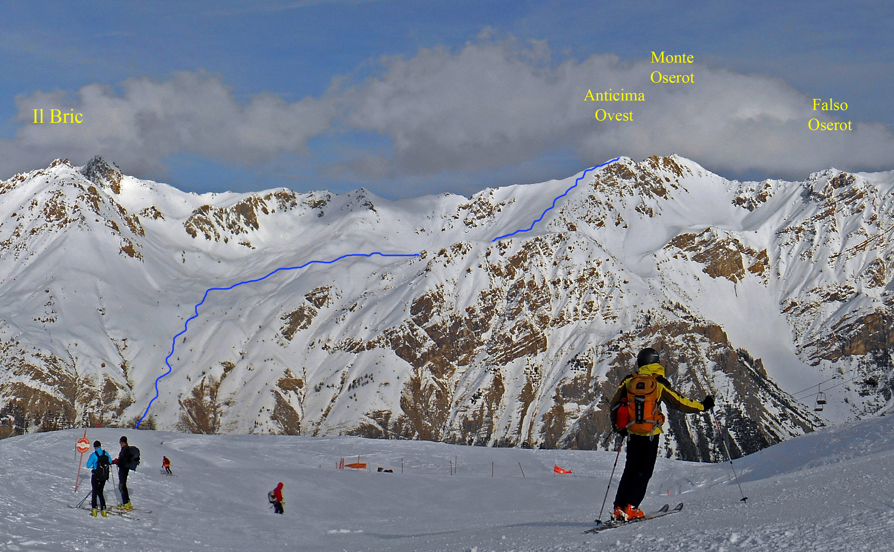 Dalla SS21 di fondovalle nei pressi del parcheggio della stazione sciistica, individuare una palina con indicazioni per la Palestra di Roccia; Seguire per poche decine di metri una sterrata, poi a 1657m salire diagonalmente verso sinistra lungo la traccia di un sentiero che taglia il ripido pendio soprastante e, oltre alcuni canalini raggiunge il picccolo ripiano 1801m che sovrasta una barra rocciosa ben visibile dalla statale. Oltre il ripiano si supera un bosco di conifere di forma triangolare, poi, l'ampio ma ripido dosso tra due canalini. Raggiunti i 2100m dove la pendenza diminuisce si piega a destra (Nord-Est) e oltrepassato il canalino, si arriva nel centro dell'ampia conca sottostante i passi Peroni e Croce Occidentale, dove si trova un ripiano 2255m. Dal ripiano si piega ancora a destra (Est) per salire fino all'ampia conca a Ovest della cima 2378m. Di qui si raggiunge e si sale con gli sci (fin dove la pendenza e le condizioni della neve lo permettono) il margine destro del lungo pendio terminale, che si restringe e si impenna gradualmente. Calzati i ramponi con neve dura, prestando attenzione alle eventuali cornici superare la stretta e aerea crestina che in breve porta alla vetta dell'anticima Ovest del Monte Oserot 2814m.