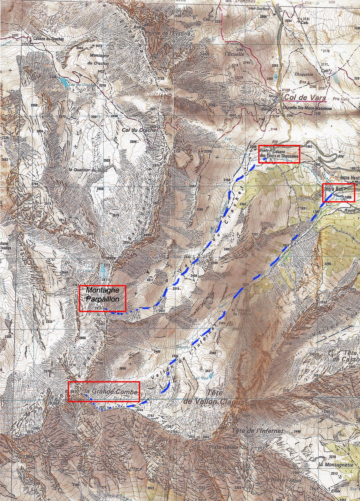 Itinerario Dal tornante 2022m prima del col de Vars (casa cantoniera) si attraversa e poi si percorre verso Sud-Ovest l'ampio e facile vallone del Rio du Crachet, all'inizio punteggiato da larici; raggiunta la quota 2322m si supera verso sinistra una rampa fino al falsopiano a 2515m, dove si piega a sinistra(sud) in direzione dell'evidente ometto di pietre sul crestone che divide il vallon du Crachet dal Vallon de l'Infernet. Il pendio Est, Nord-Est sommitale più ripido (placche possibili) si sale da sinistra verso destra, non distante dalla cresta Est.