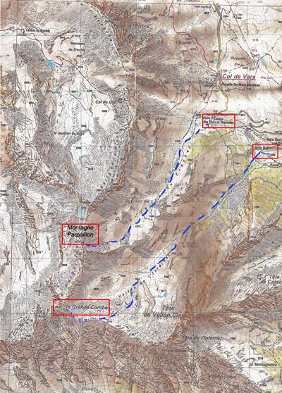 Discesa Lungo l'itinerario di salita, oppure con neve sicura scendere direttamente dalla Cima. Con neve trasformata sicura scendere in direzione Sud-Est verso il Vallon dell'Infernet dalla cresta sommitale (prima parte con pendenza 35-40°)