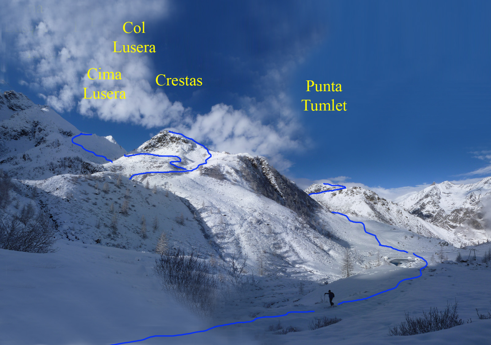 Benot-Tumlet fino in cima. Scendere lungo la pista Tumlet dietro e lago