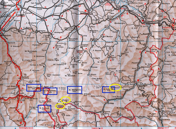 Sempre sulla strada per Upega, ma al bivio per Carnino, partono i percorsi per la Testa Ciaudon, il Marguareis ed il Mongioie, raggiungibile anche da Viozene.