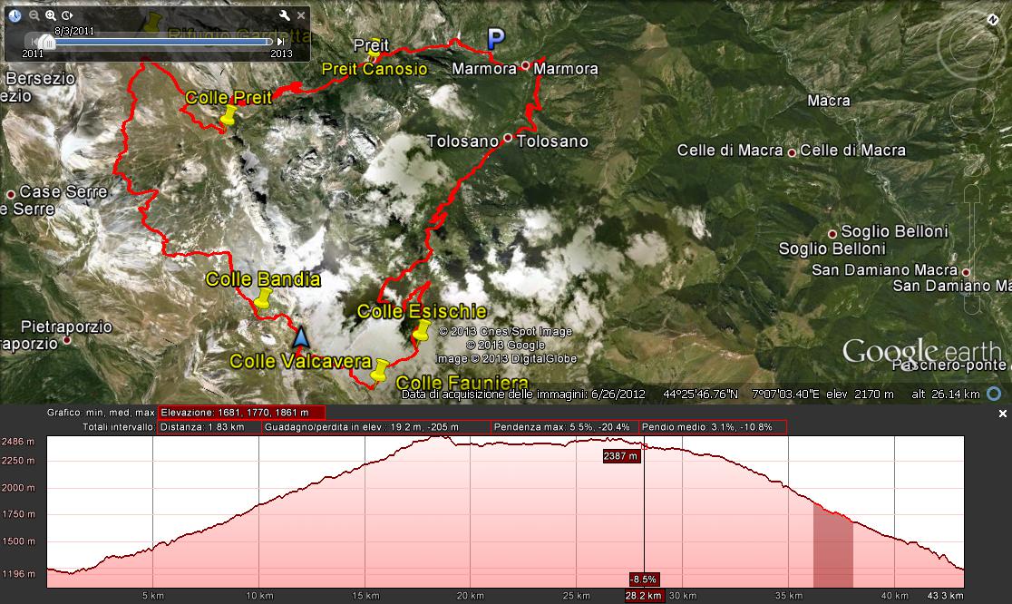 Dalla piazza di Canosio (1275m) scendere al bivio di Marmora toccato nell'accesso stradale, seguire la strada in salita in direzione dell'abitato di Arata (1390m); superare la borgata e continuare lungo la strada che con lunghissima salita sempre su asfalto, con pendenze modeste porta a Tolosano (1502m) e poi al km 14 (2100m) nei pressi dell'alpeggio Gias Il Ghetto, dove la strada si alza sul versante a sinistra per arrivare al colle di Esischie al km 17,5 (2370m). Salire altri 100m per raggiungere il Colle di Morti o Col Fauniera (2480m) dove c'è un cippo dedicato a Marco Pantani. La strada prosegue ora in discesa attraversando il Vallone dei Morti fino al Colle Valcavera al km 19 (2410m). Piegare a destra e scendere su strada sterrata fino al colle della Bandia 2408m, dove si ignora la deviazione che scende alla sinistra e proseguire su tratto pianeggiante fino al colle Margherina al km 23 (2420m). Qui la larga sterrata militare piega a sinistra, raggiunge il colle Cologna al km 23,7 e riprende a salire. Al km 24,4 trascurare la deviazione che sale a sinistra al colle Salsa Blancias e proseguire sul lungo e spettacolare percorso che al km 27,2 (2330m) trova il bivio per il Rifugio Gardetta a sinistra. Proseguire diritto in costante discesa fino al km 34,8 (2080m) al colle del Preit (agriturismo "La Meia"). Dal colle si ritrova l'asfalto e con veloce discesa si ritorna a Canosio.