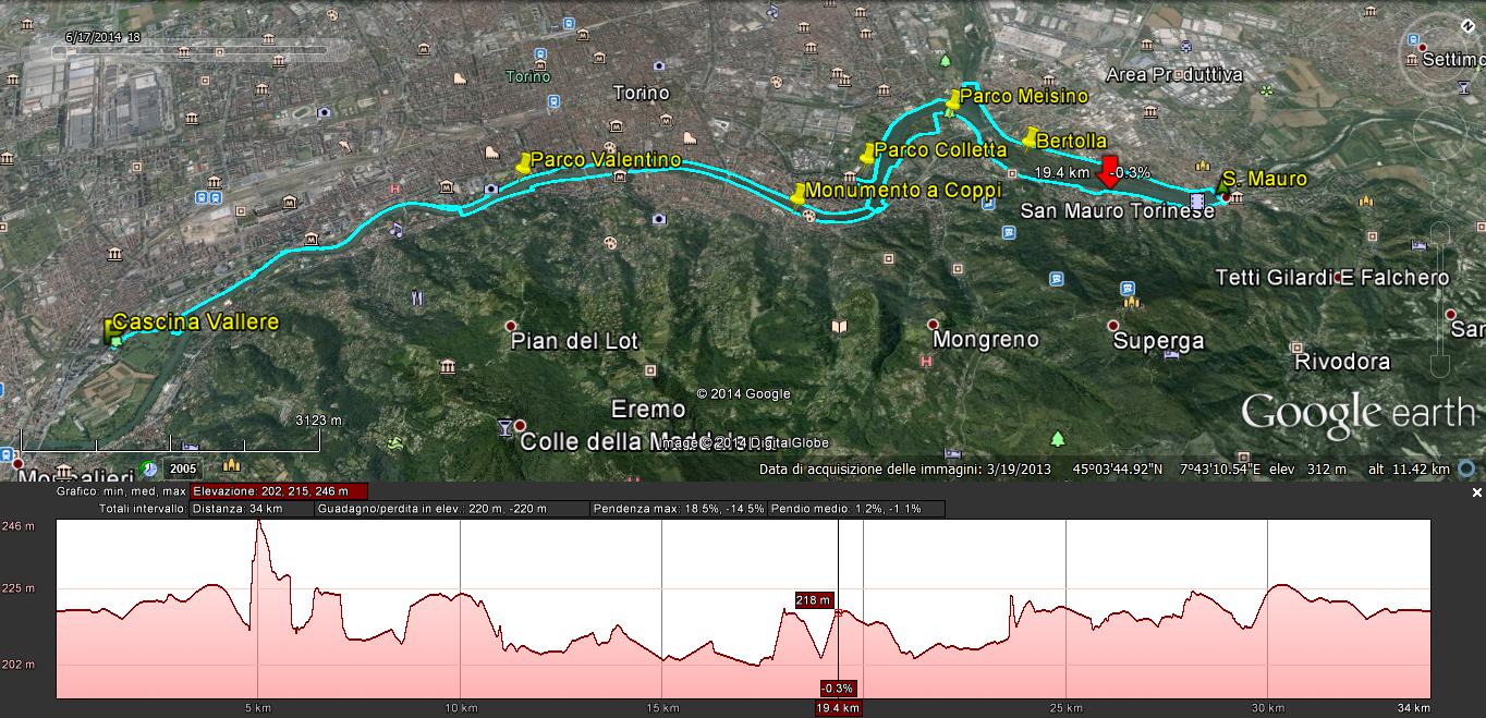 Moncalieri (Vallere) Difficoltà: Nessuna Distanza: 36 km Bicicletta idonea: bici da corsa sconsigliata Difficoltà: TC Ciclabilità: 100 % Cartografia, Bibliografia: Parco fluviale del Po Torinese 1:50.000 Carta dei percorsi ciclabili e guide descrittive del Parco fluviale del Po torinese, Torino 2009 Effettuato il: 25 Agosto 2014 |