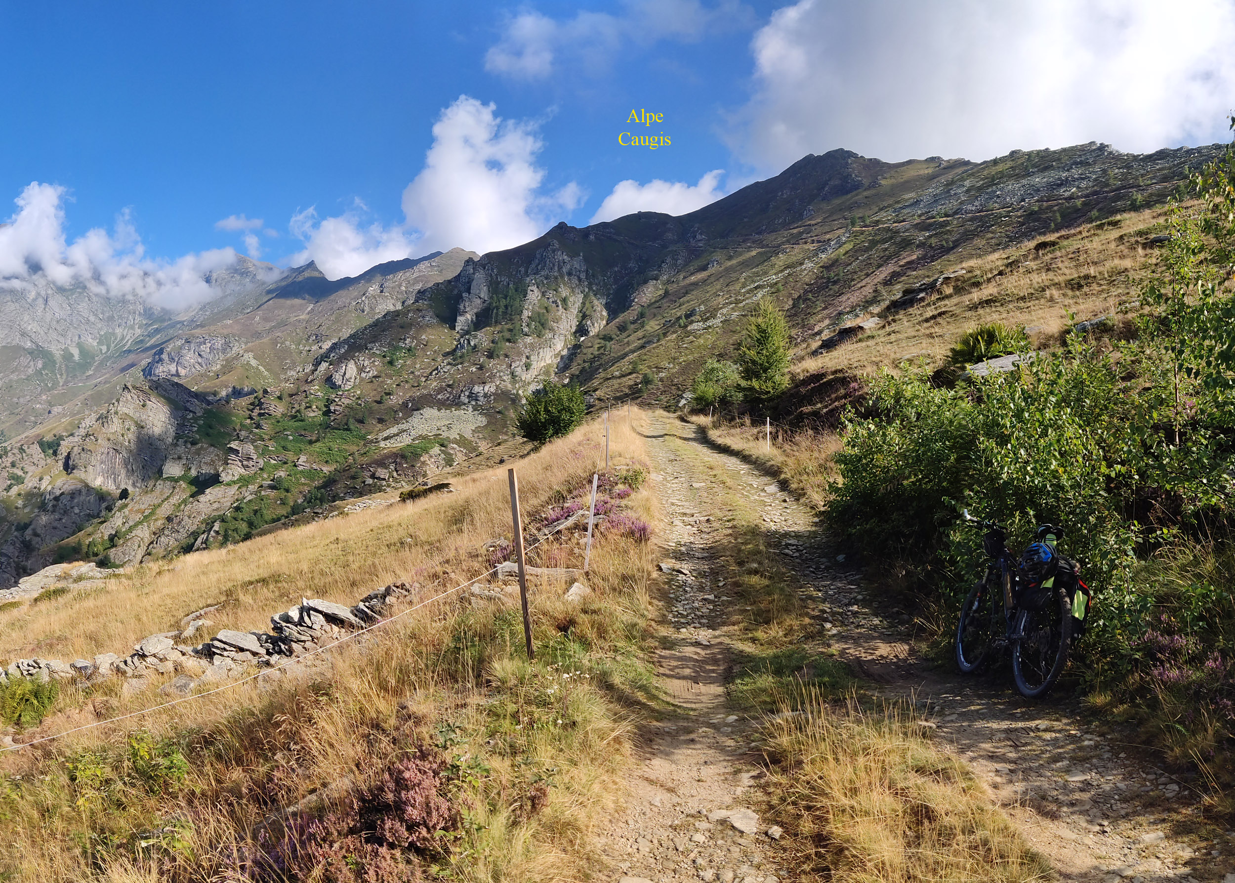 L’itinerario si sviluppa per circa 26 Km di cui 16 km su strada sterrata. Dopo aver attraversato diversi alpeggi, dominando il vallone degli invincibili, si giunge all’alpe Caugis, dove si trovano diverse baite tra le quali il bivacco rifugio Caugis, che può offrire un accogliente riparo.