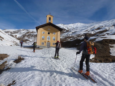 Itinerario Da Lausetto, proseguire lungo il versante destro orografico del vallone ed, oltre la borgata Colombata 1585m quando la strada si avvicina al rio Mollasco, non attraversare il ponte di ferro 1591m a destra (itinerario per il Monte Ruissas) e seguire la riva destra orografica del Rio Mollasco, dopo averlo attraversato per un breve tratto, ritornare sul versante iniziale, alle pendici della Costa Cervet. Con un tornante la carrozzabile prende quota su un poggio e, dopo le grange Merletto 1699m, si incunea nuovamente nel vallone del Rio Mollasco, con un tratto obbligato, che attraversa diversi colatoi ed è quindi soggetto alle valanghe. Varcare il torrente su un ponte di legno e, tagliati sulla sinistra alcuni tornanti pervenire alle grange Varzio 1913m e quindi raggiungere la Cappella della Madonna delle Grazie 1990m. Abbandonare la strada e risalire verso Nord-Est i solari pendii alle spalle della Cappella, in un lungo susseguirsi di dossi e valloncelli con pendenza sempre moderata e senza percorso obbligato, fino a raggiungere, verso 2500m il vago Pian Gast. Tenendosi alquanto sotto il filo della Costa Sebolet, spartiacque tra i Valloni di Rio Mollasco e di Verzio, oppure raggiungere la stessa in un punto qualsiasi; seguire la dorsale verso sinistra. Transitare alla base delle modeste elevazioni che movimentano il crinale (l'ultima delle quali 2997m, dirama verso Nord-Est la dorsale che forma la Rocca Marchisa ed il Pelvo d'Elva) e raggiungere la deppressione 2950m sotto la vetta, dove la cresta s'impenna. Con un tratto più ripido (attenzione alle cornici) percorribile normalmente con gli sci, risalire la cresta lungo il versante Sud e guadagnare la piatta Cima Sebolet 3018m. Discesa Lungo l'itinerario di salita, oppure, con condizioni di neve sicurissima scendere direttamente dalla vetta, lungo la linea di massima pendenza, il ripido e costante versante Sud (circa 500m a 30°). Abbandonare il valloncello di Rio Giacomanda e, con percorso non obbligato attraversare verso sinistra in direzione della Cappella della Madonna delle Grazie (visibile fin dalla vetta), ricongiungendosi all'itinerario di salita nei pressi della Cappella. |