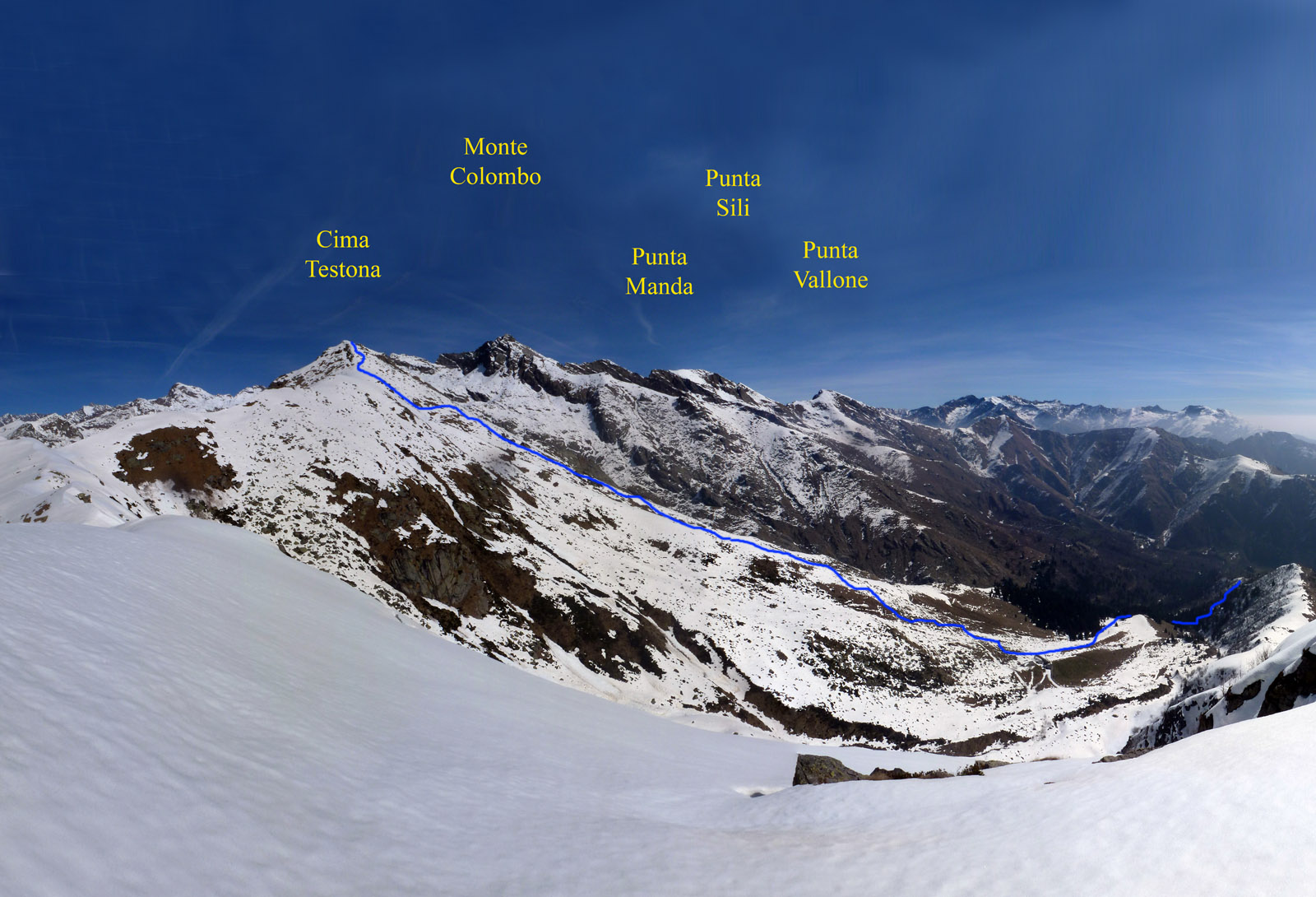 La Cima Testona è una bella gita su ottimi pendii, da effettuare con neve abbondante e già trasformata. Offre un buon panorama sul Monte Colombo e sul versante Sud del Gran Paradiso.