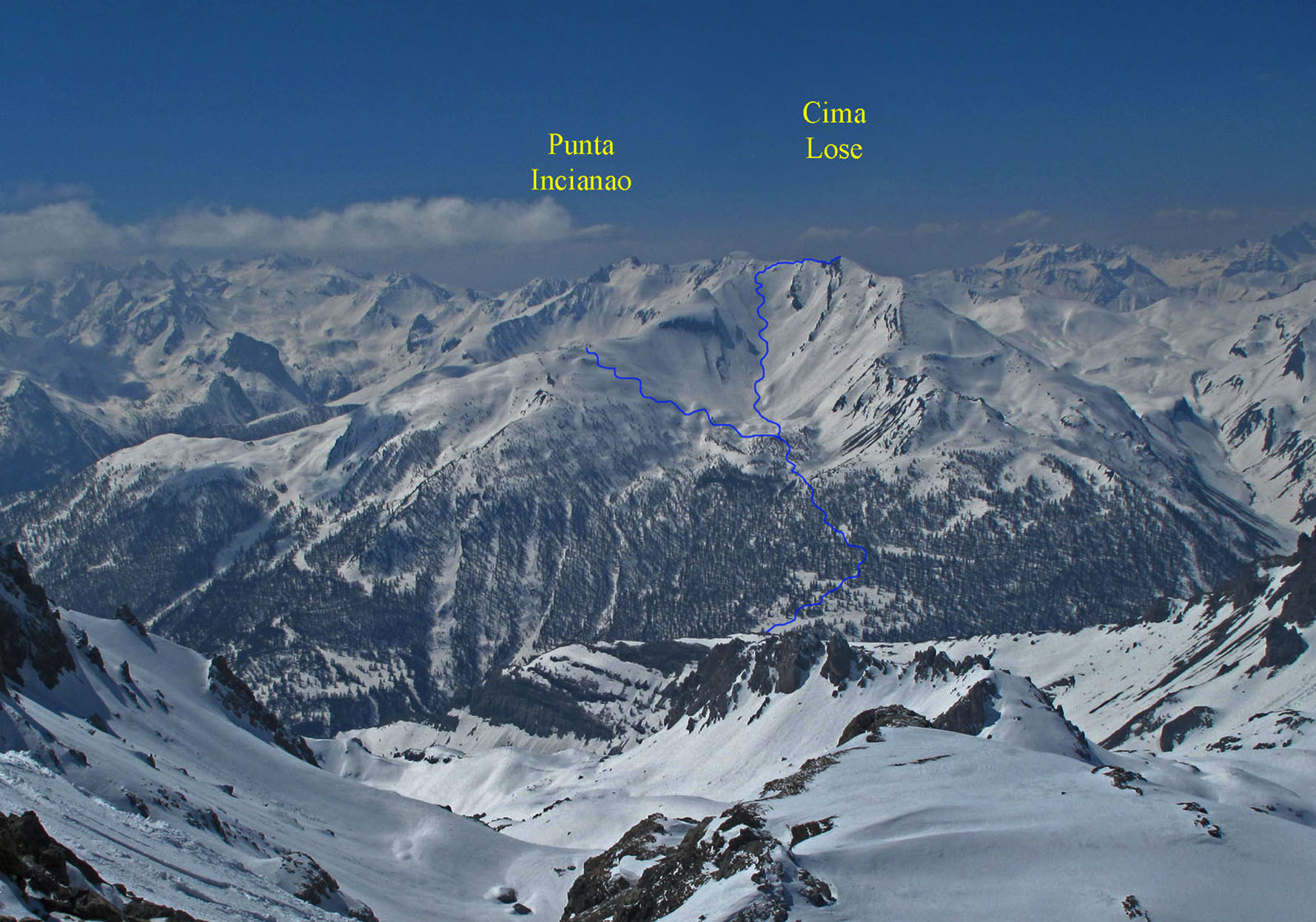 Da Argentera attraversare il ponte sulla Stura e costeggiare il torrente per circa 300m lineari. Salire in direzione Sud nel bel bosco di larici, intervallato da radure naturali. A 1900m effetuare una leggera diagonale a sinistra, fino a raggiungere il bordo inferiore di una grande conca dove il bosco finisce. Proseguire nel vallone compreso tra la Punta d'Incianao e la Cima delle Lose, lasciando a destra il Gias delle Lose. Per comodi valloncelli si arriva all'imbocco del ripido canalone, salirlo cercando le zone meno pendenti, raggiungendo la cresta a 2710m e l'anticima a 2730m. Proseguire lungo la cresta nevosa in direzione Nord-Ovest con gli sci fino agli ultimi metri che si salgono a piedi.