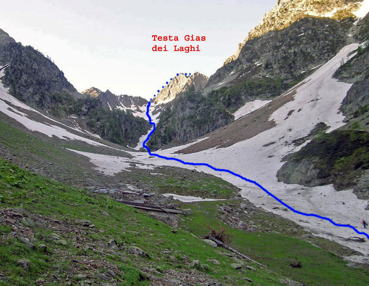 Questo itinerario, percorso come descritto, oppure in traversata, raggiunge la bella cima della testa Gias dei laghi, punto nodale tra i valloni di Rio freddo, sant'Anna e Maladecia.