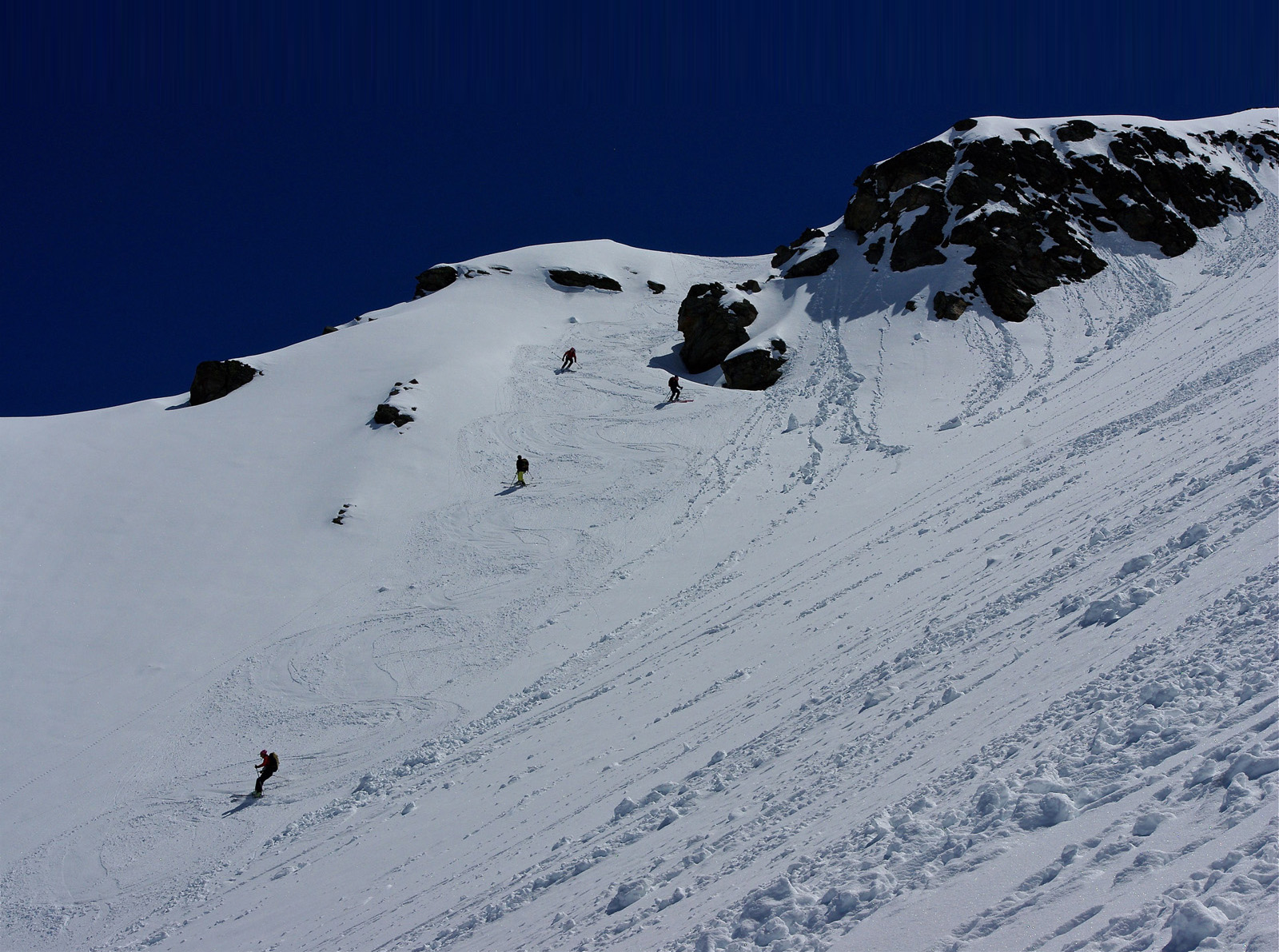 Lungo l'itinerario di salita oppure se le condizioni di innevamento lo permettono è consigliabile tornare indietro per la via di salita fino a poche decine di metri sotto la quota 2960m, piegando poi decisamente a sinistra portandosi sul versante Nord. Si percorre il fondo del valloncello sottostante fino a giungere a una serie di risalti. Per superarli occorre poggiare a sinistra e calarsi per un canale ripido (35° per un centinaio di metri) con il quale si raggiungono i pendii via via meno ripidi che portano alla destra del Lac du Lavoir. Si piega a destra (Est) e si costeggia perdendo quota meno possibile, per portarsi al fondo del vasto Piano delle Pianche o dei Seirous presso il ponticello a quota 2197m. Seguendo all'incirca il tracciato della mulattiera estiva ci si riporta sulla via di salita poco a monte della Maison des Chamois.