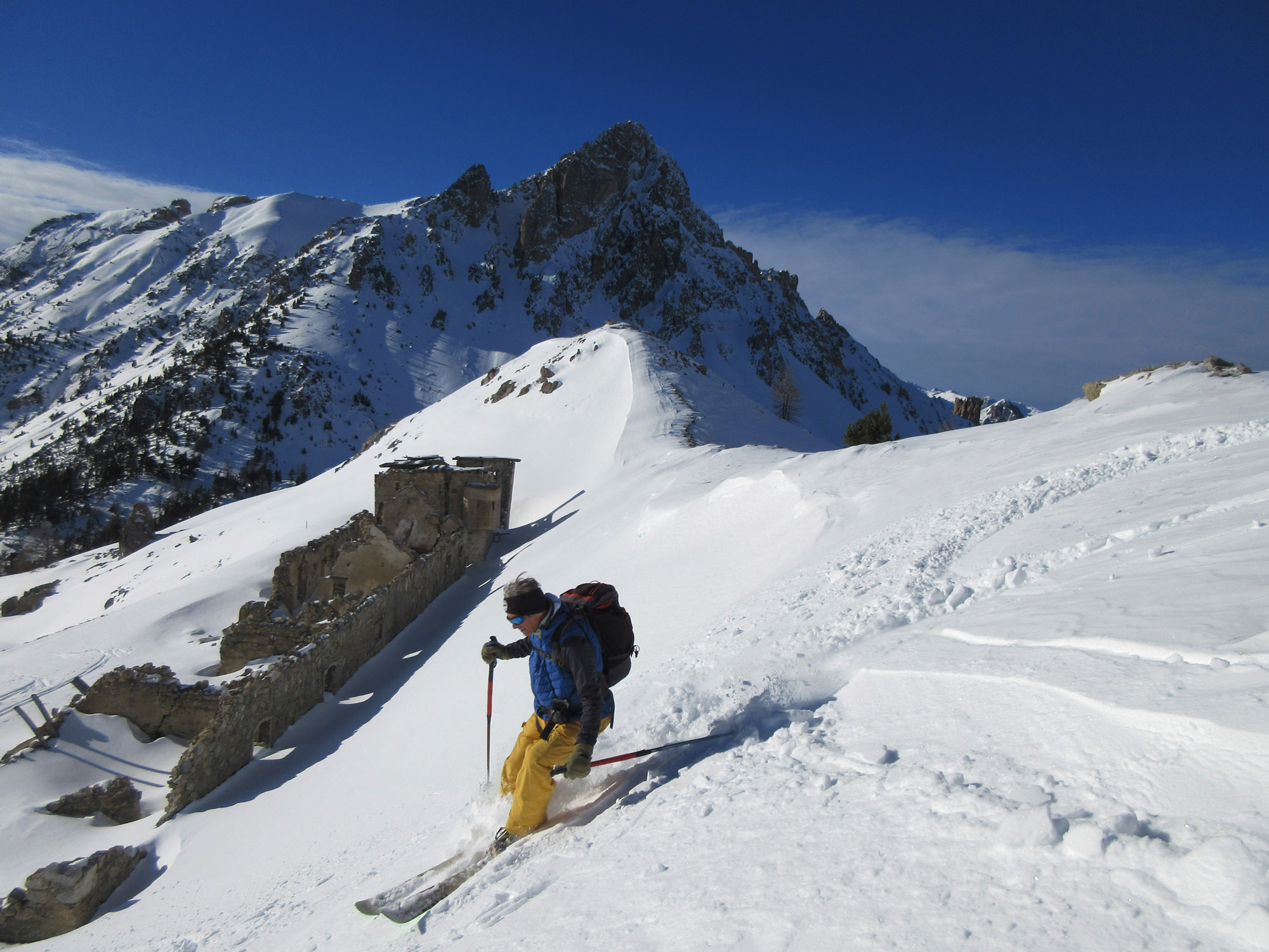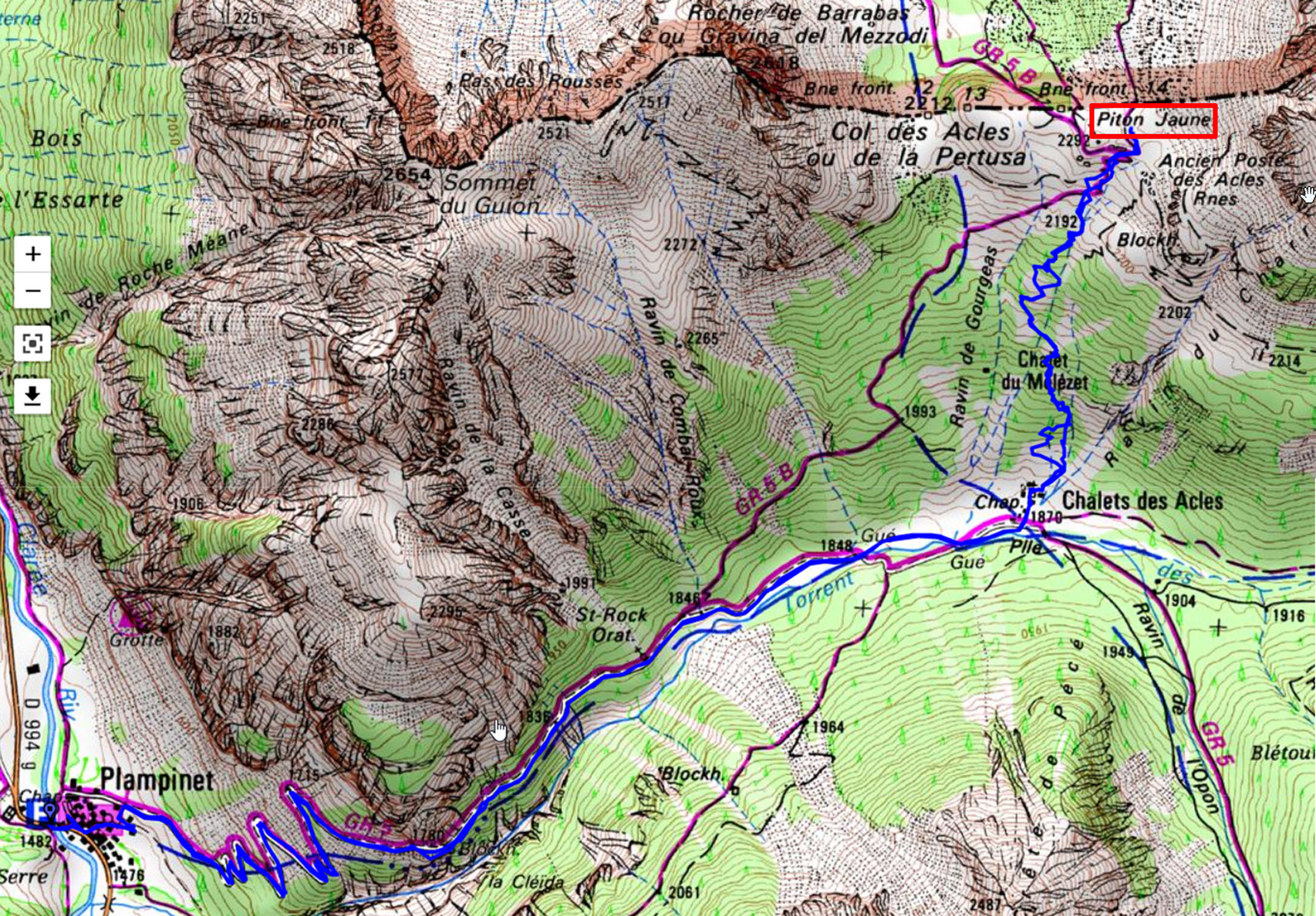 Itinerario Dal parcheggio nei pressi del ponte di Plampinet, attraversare il paese e salire lungo la stradina asfaltata fino all'inizio della sterrata per il Vallone des Acles. La strada risale a tornanti il pendio, quindi si addentra nel vallone sul versante destro orografico. Superata la piccola cappella di S. Roch, con percorso a lieve pendenza raggiunge il pianoro dove si trova la borgata degli Chalets des Acles 1880m. Salire verso Sud in direzione del Col des Acles, giunti fuori dal bosco, raggiungere i resti del Baraquement des Acles (forte) e puntare alla cresta soprastante (Piton Jaune) 2291m Discesa Lungo l'itinerario di salita. |