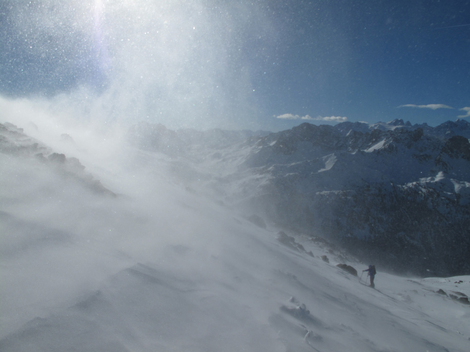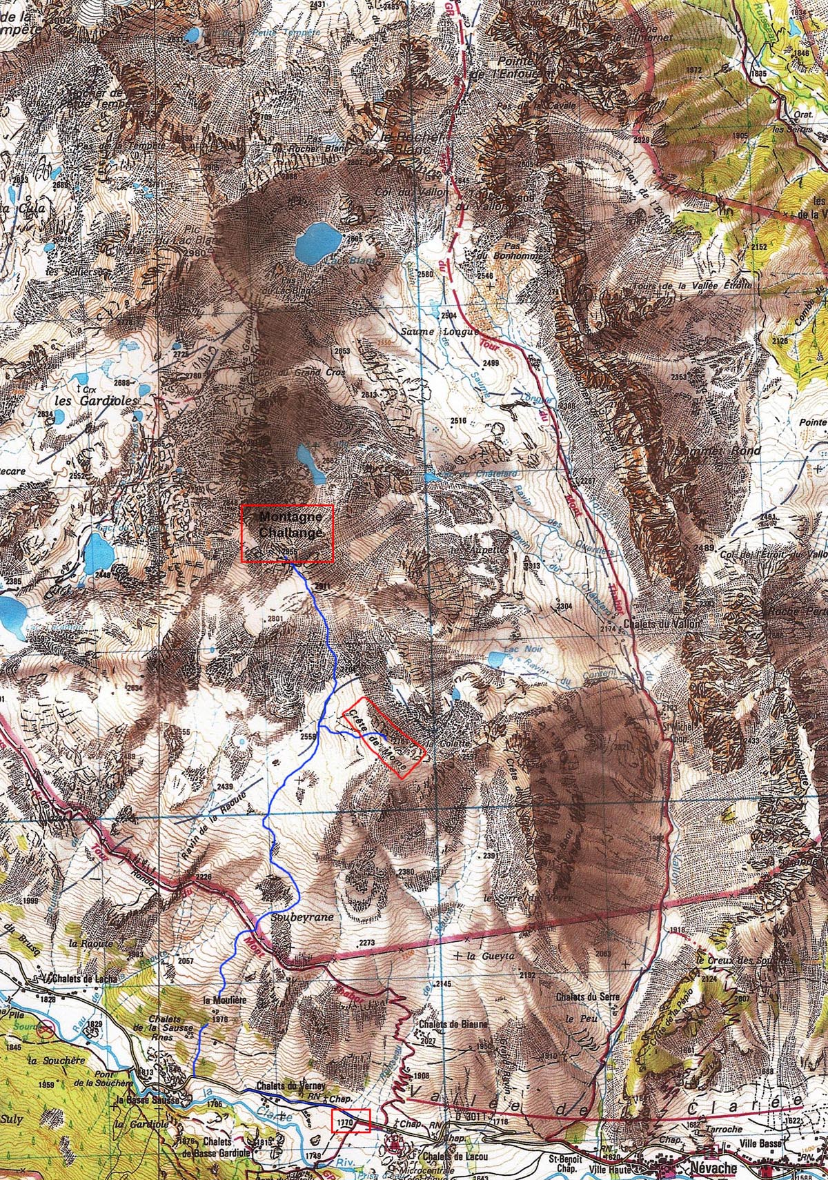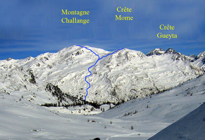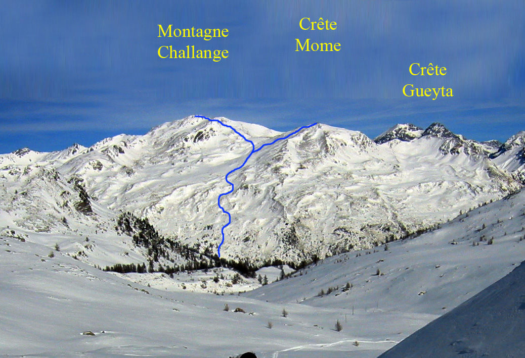 Itinerario Da Nevache proseguire lungo la strada dipartimentale fino al bivio per il Refuge Buffère 1770m. Dal bivio per il Refuge Buffere continuare lungo la strada fino a prima del dosso della Basse Sausse, quindi a salire a destra nel bosco rado; dopo aver incrociato i ruderi della borgata La Moulière 1976m, proseguire lungo pendii aperti e mediamente ripidi, fino a sbucare sui pianori alti, superare il sentiero Chemin de Ronde e gradualmente dirigersi a sinistra, seguendo nella parte alta l'avvallamento del Ravin de la Raoute, fino in vista di un colle 2704m, tra la Crête de Mome e la vetta della Montagne de Challange. Girare a destra e raggiungere la Cima 2761m. Discesa Lungo l'itinerario di salita. |