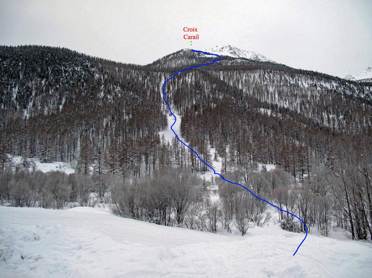 La Croix Carail è situata alla quota di 2369m, ma la cima sciistica 2400m, dove sale la maggior parte delle persone è una trentina di metri più in alto. Occorre attraversare la crestina e per comodi pendi raggiungere la puntina facile che prosegue poi per la Cresta del Bois Noir fino alla cima del Rocher des Raisins.