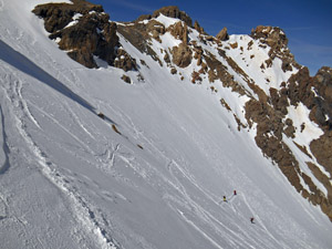 Itinerario Da Nevache proseguire lungo la strada dipartimentale fino agli Chalets de Lacou. Dirigersi verso il fiume e attraversarlo sul ponte di Rately (pannello indicatore). Seguire in direzione Sud, Sud-Ovest il sentiero (GR 57) per il Refuge de Buffère. Superato il rifugio proseguire lungo pendii aperti e dolci che portano al Col de Buffere. Intorno a quota 2150m-2200m dirigersi verso la base del canalone Nord. Risalire il canalone sino al termine e dal colletto sommitale pochi metri a sinistra conducono alla croce di vetta. Discesa Discesa sul percorso di salita sino al rifugio. Da qui, in direzione Nord, discesa diretta nel bosco. Bella discesa ripida in bosco ben sciabile |